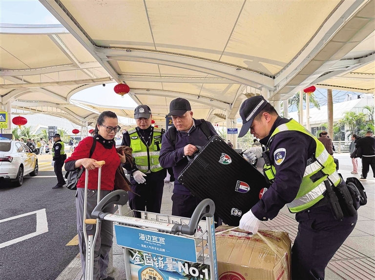 2月2日,省公安廳機場公安局交通管理支隊民警為行動不便的旅客搬運行李。記者黃君 攝