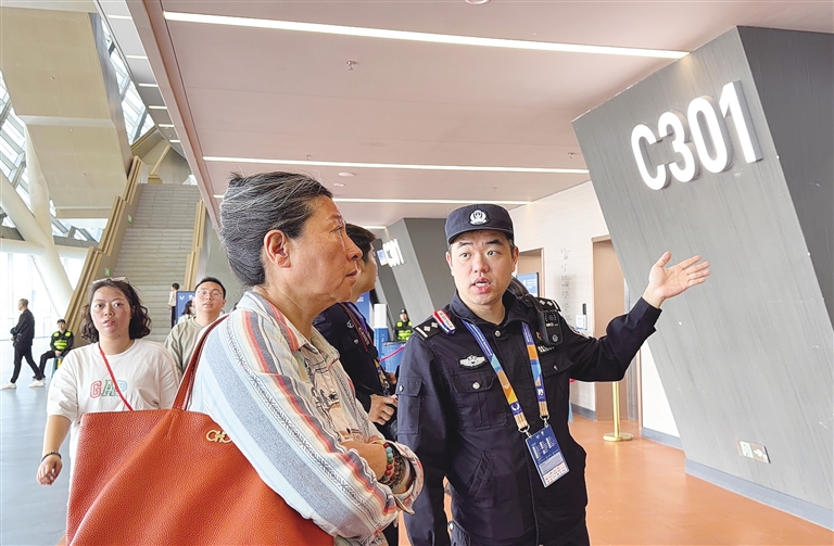 第35屆國際乒聯(lián)-亞乒聯(lián)盟亞洲杯現(xiàn)場,民警耐心為觀眾提供幫助。記者黃君 攝