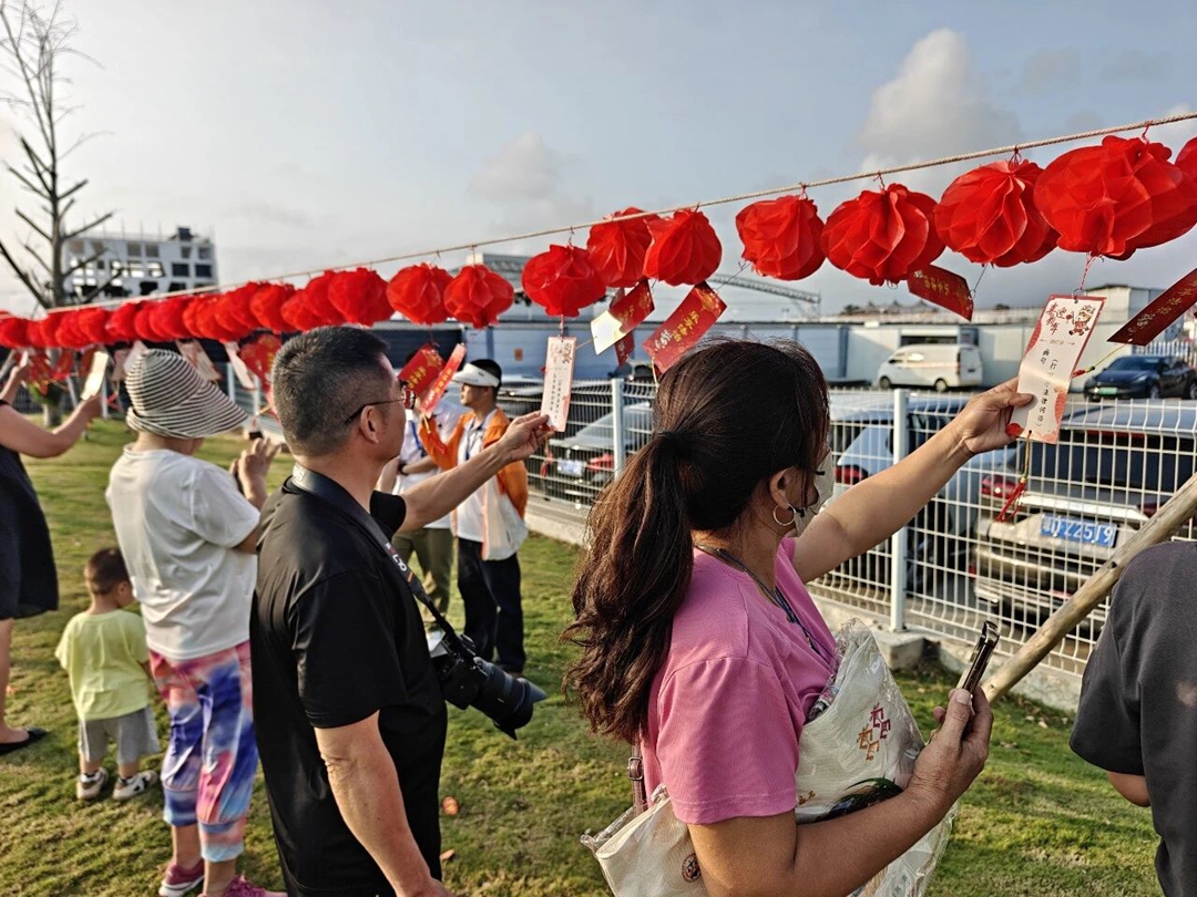 縣司法局設置的“花燈猜謎”區人氣最旺。燈謎紙條在風中輕輕搖曳,謎面既有傳統燈謎,也融入《中華人民共和國民法典》《中華人民共和國未成年人保護法》等法律知識。不少市民游客駐足觀賞,有的低聲討論,有的當場作答。猜中謎底的群眾在歡呼聲中領取小禮品,笑意寫在臉上。