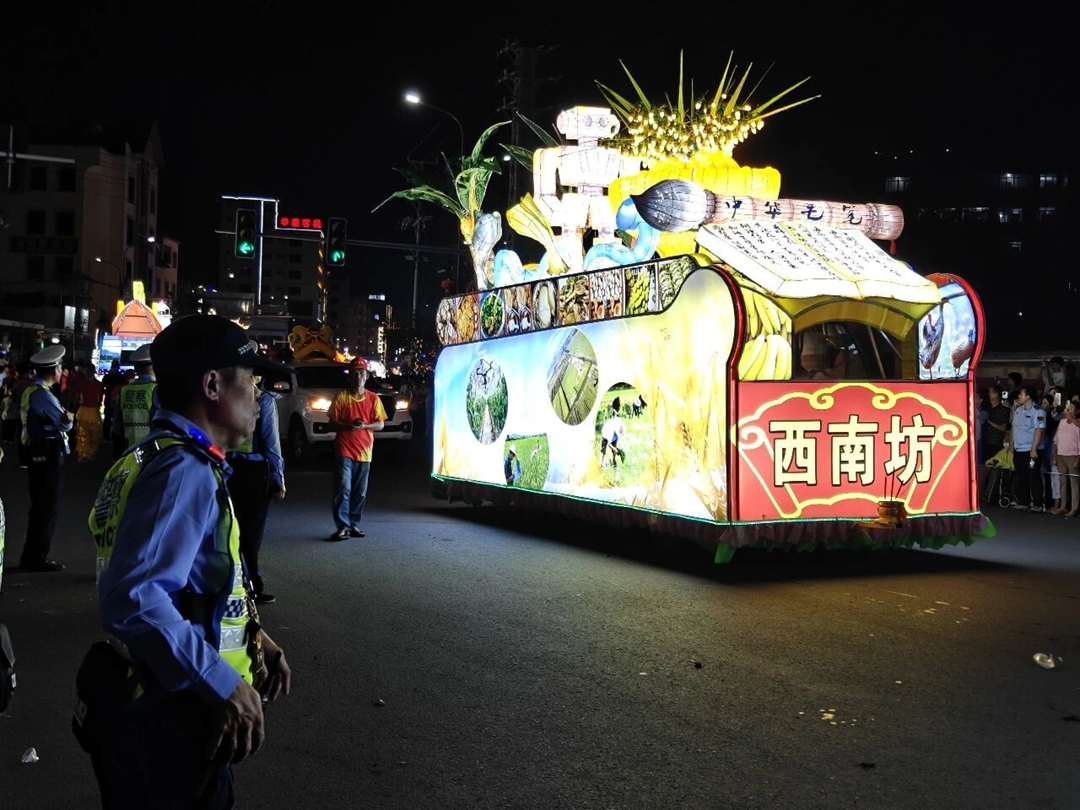 晚8時許,鼓點鏗鏘,彩燈齊明。由十余輛花車組成的巡游隊伍緩緩前行,長龍般的燈陣在夜色中流光溢彩。傳統花燈造型各異,或靈動、或威武,引來陣陣贊嘆。在眾多花燈中,一輛造型獨特的主題花車格外引人注目——“法治護航自貿港”花車。