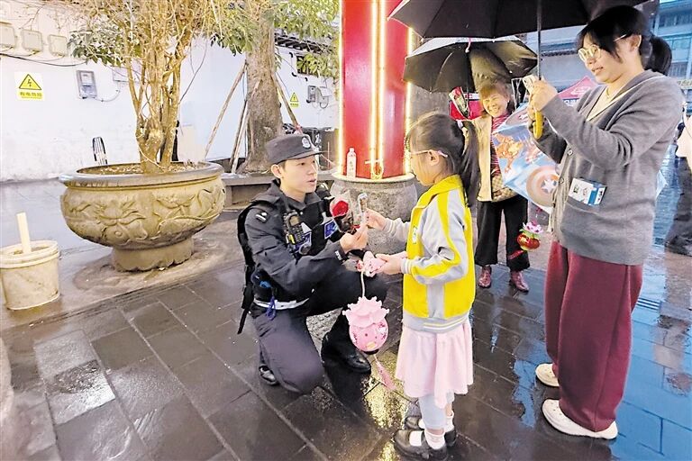 3月3日晚,元宵佳節,春雨綿綿。海南海口府城元宵換花節現場之一的海口府城福地美食街門前,游人如織、暖意融融。海口市公安局瓊山分局反詐中心民警王安旺正用一份小禮物,溫暖著一名前來換花的小孩。