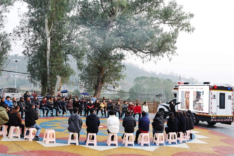 近日,重慶市綦江區人民法院干警背著“法治行囊”,將“車載便民法庭”駛入安穩鎮上壩村,與村民們圍坐在農家院壩,在煙火家常中開了一場有聲有色、有“法”有“料”的普法院壩會(如圖)。
