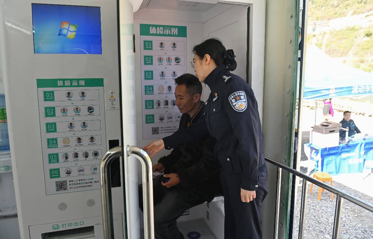 30日中午1時,扒昔加古寨廣場上早已熱鬧起來。車管所民警們帶著全套設備抵達現場,分工協作搭建臨時辦理點:藍色帳篷穩穩撐起,塑封機、打印機、電腦等設備一字排開,有條不紊地完成調試;服務直通車接駁電源后,車廂內的電子屏隨即亮起,滾動播放著通俗易懂的交通安全知識;另一側,自助體檢機成功連接醫院和公安業務后臺,隨時準備為群眾提供體檢服務。