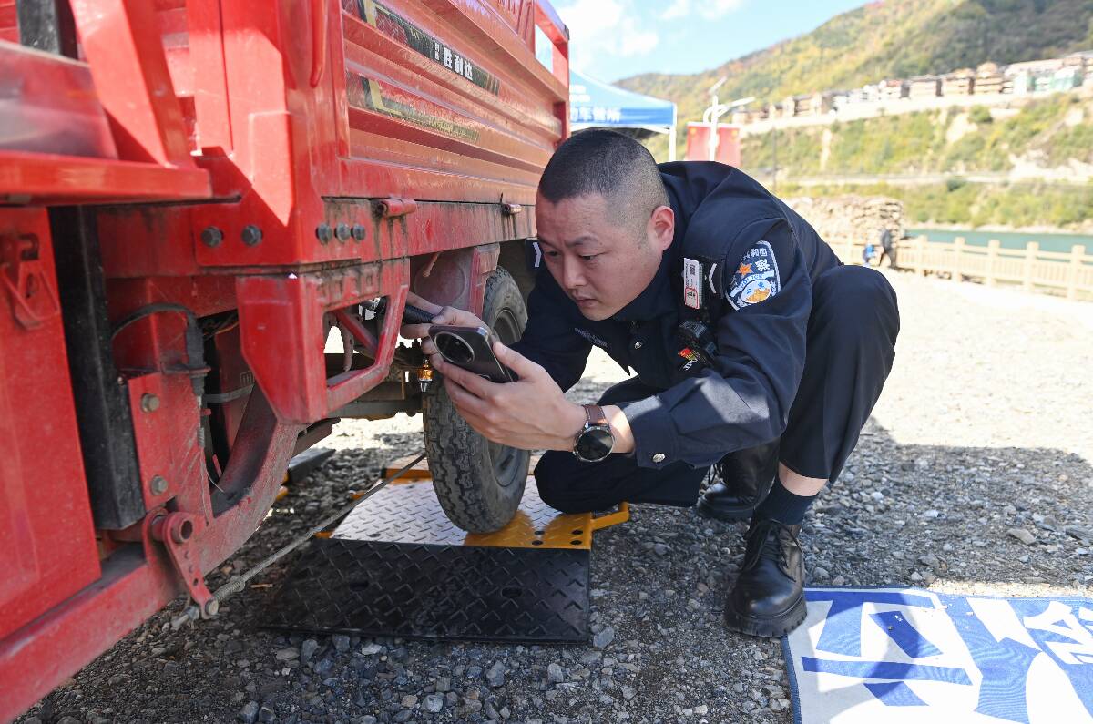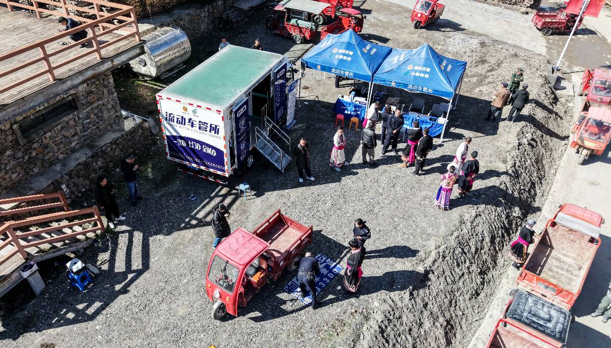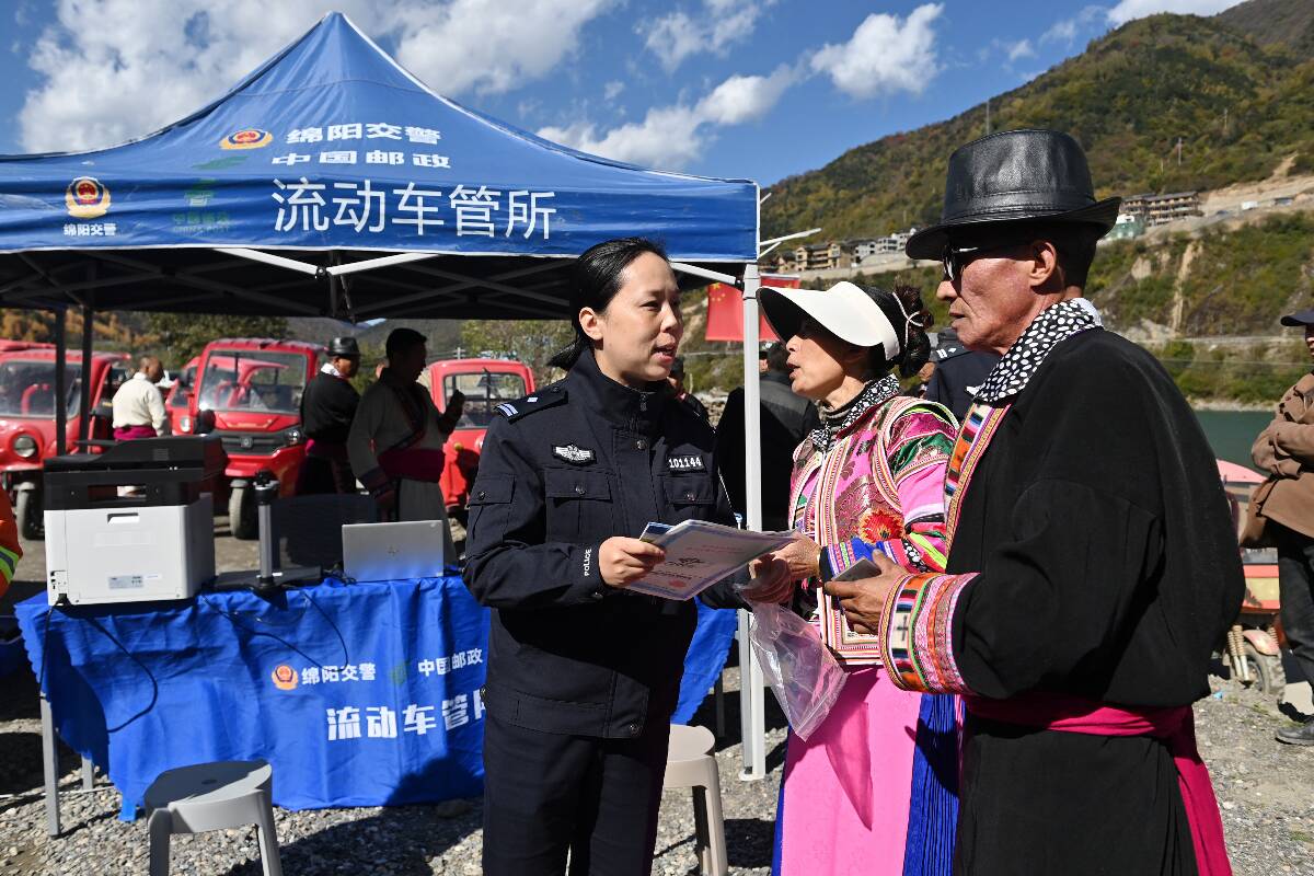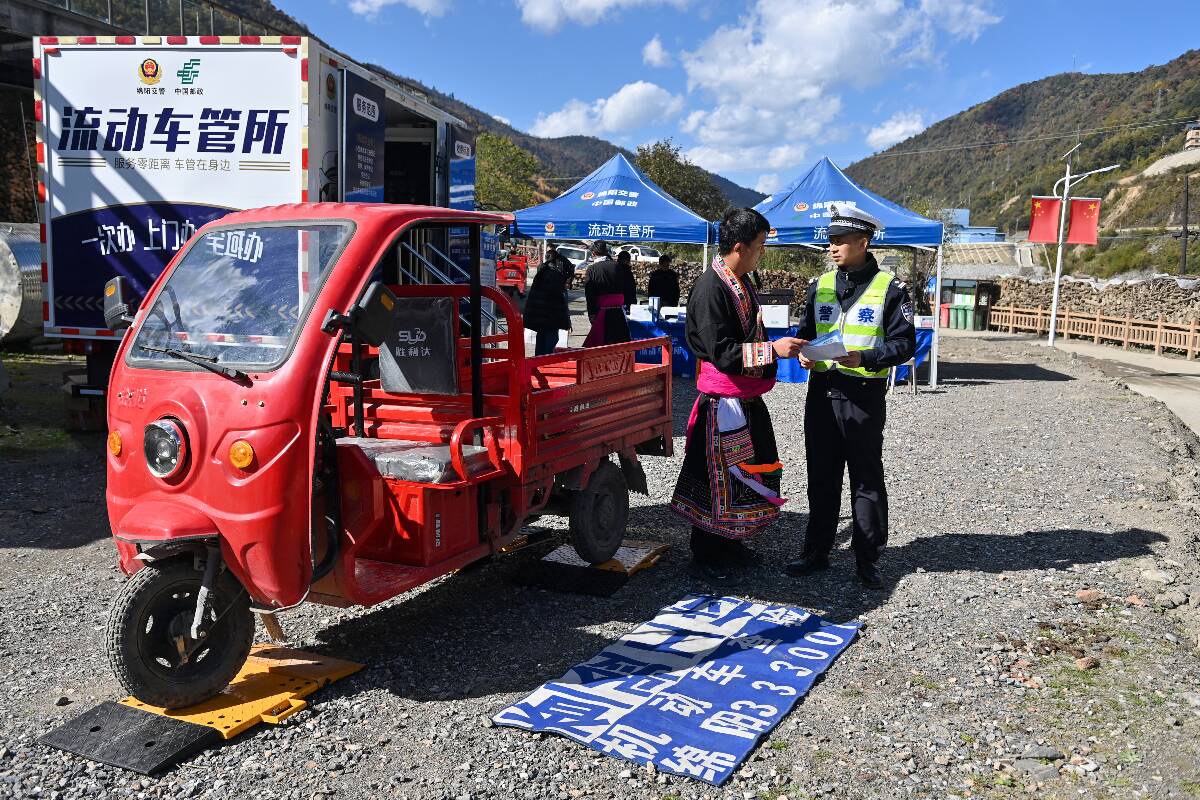帳篷前的空地上,民警正利用便攜式電子稱對一輛三輪摩托車進行稱重查驗?!稗r村地區有很多這種拉貨載物的三輪摩托,就拿白馬鎮來講,以前群眾上牌要去80公里以外的平武縣城里的車管所,來回成本高還耽誤時間。許多群眾覺得麻煩就不想上牌照了,這也帶來了很大的交通安全隱患?!爆F場辦理民警告訴記者,“現在車管服務直通車直接開到村寨里,我們帶了便攜設備對車輛進行現場查驗、受理上戶業務,手續資料齊全的情況下,3個工作日內新牌照就能寄遞到群眾家里?!痹诩议T口就能上牌,如此便利也整體提高了摩托車、電動車的上戶率,從源頭夯實了道路交通安全基礎。
