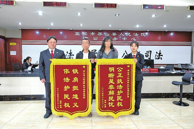 2024年10月28日,屏山縣法院大門口鑼鼓喧天。一隊腰鼓隊在聶某的帶領(lǐng)下,敲鑼打鼓地來到法院,將一面印有“鐵肩擔(dān)道義,依法護(hù)民權(quán)”的錦旗送給為他拿回12000元執(zhí)行款的“山鷹執(zhí)行”團(tuán)隊。