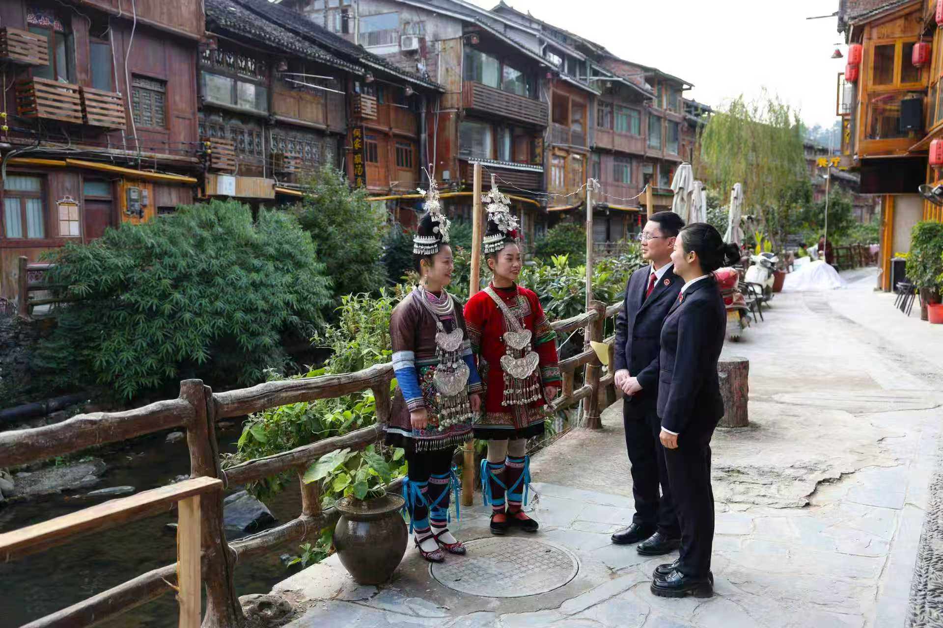 肇興侗寨風雨橋邊,貴州省黎平縣檢察院檢察官正向侗族大歌傳承人了解非遺傳承情況。
