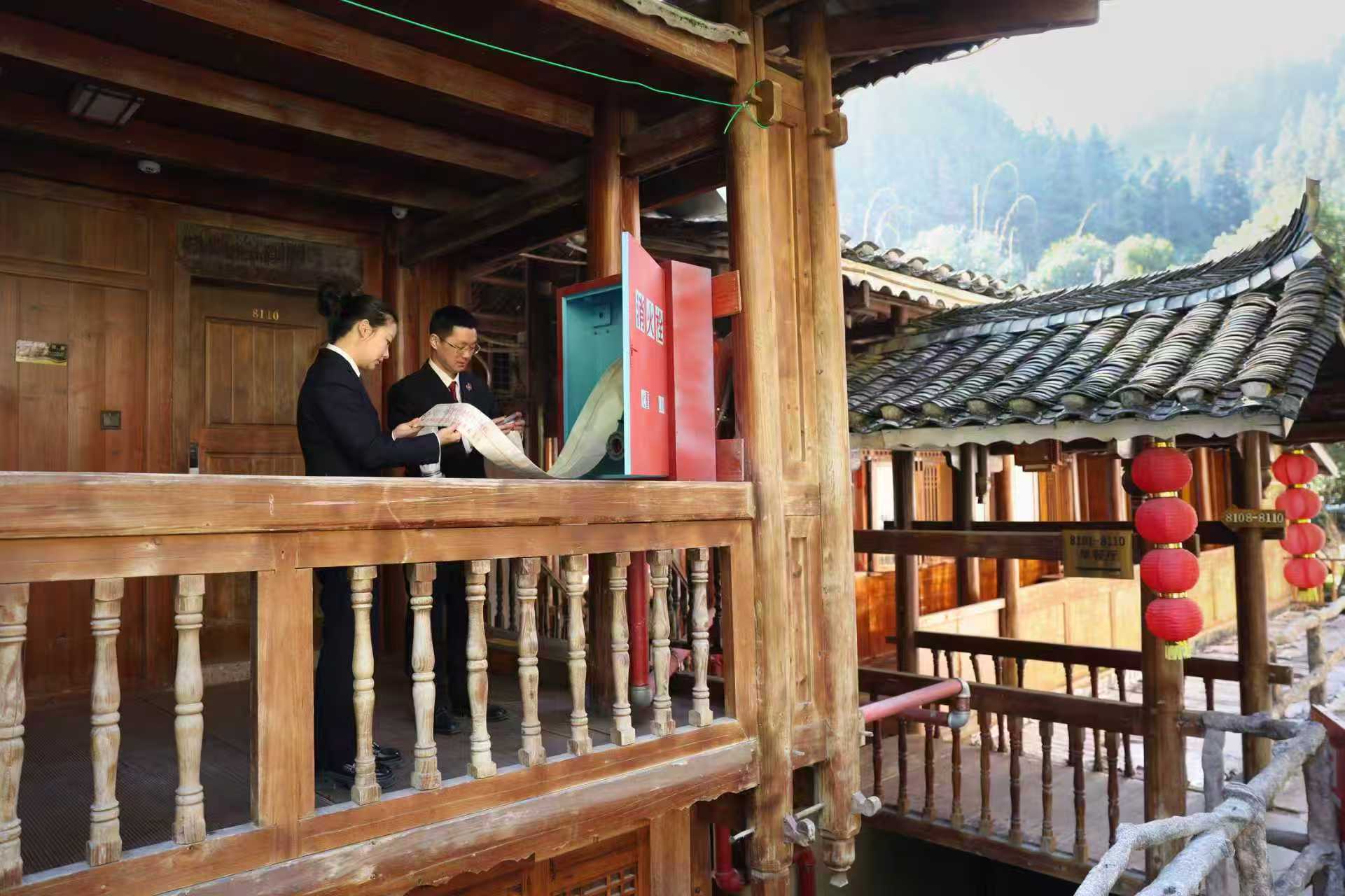貴州省黎平縣檢察院檢察官來到肇興侗寨附近民宿了解消防設施設置情況。