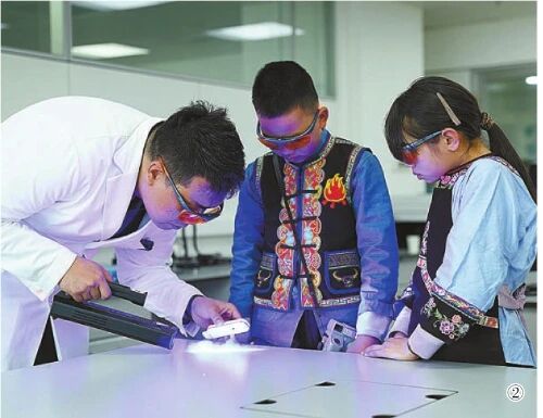 最高檢檢察技術信息研究中心物證技術處副處長張磊向李昌穎和汪政怡介紹檢察機關如何借助科技手段辦理案件。李昌穎和汪政怡佩戴護目鏡體驗指紋識別技術