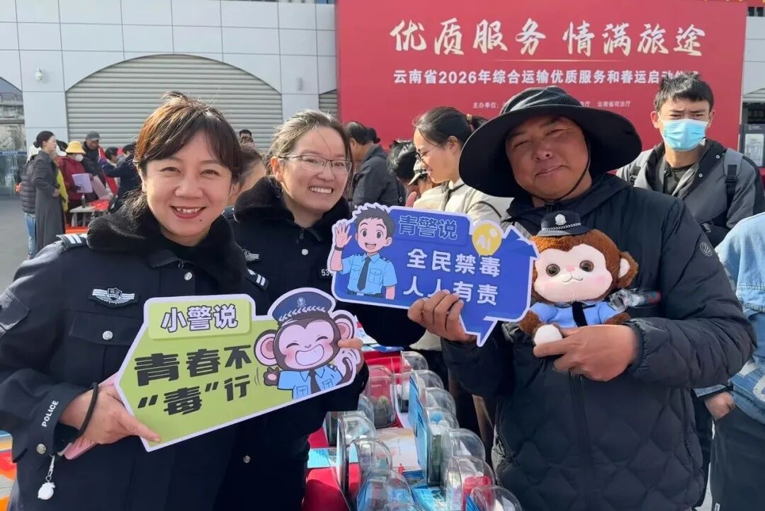 春運啟幕,法治同行。2月2日上午,云南省2026年綜合運輸優(yōu)質(zhì)服務(wù)和春運“優(yōu)質(zhì)服務(wù)情滿旅途”啟動儀式在昆明站北廣場舉行。按照統(tǒng)一安排,云南省戒毒管理局組織禁毒宣講團參加啟動儀式及現(xiàn)場普法宣傳活動,積極融入全省春運服務(wù)保障工作大局。