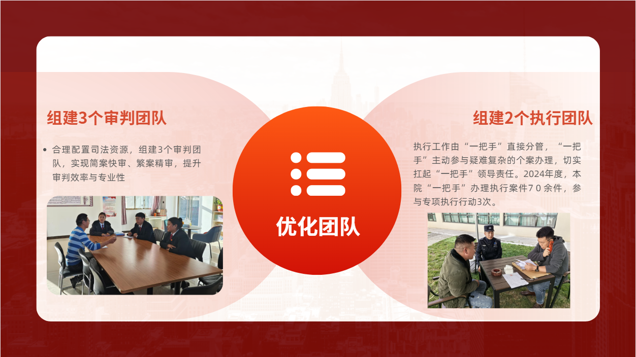 組建2個執行辦案團隊和3個審判辦案團隊,全面釋放辦案效能。制發《墨脫縣人民法院關于全面落實案件閱核工作機制的辦法(試行)》,院庭長閱核案件287件。與墨脫縣人民政府聯合印發《關于規范和推進行政強制執行案件“裁執分離”工作的通知》,為墨脫國家重大項目的順利開展提供制度保障。積極推廣使用“人民法院在線服務平臺”“人民法院調解平臺”“12368”服務熱線等線上平臺,以設立導訴區、便民服務區和跨域立案服務窗口等方式為支撐,實現立案等事務一網通辦、一號通辦,推動“一站式”建設從“有”到“優”的轉變。強化訴訟糾紛解決機制與非訴糾紛解決機制的銜接,訴前調解案件數量同比上升70%,現代化多元解紛服務體系成效初步彰顯。開展區內外執行專項行動5次,覆蓋50余個市縣,辦理本院案件47件,協同兄弟法院辦理24件。與全縣18家單位召開執行聯席會議,聯合公安機關布控36人,觸控11人。2024年執行完畢率、執行到位率、終本率三項重點指標均排名全市第一。