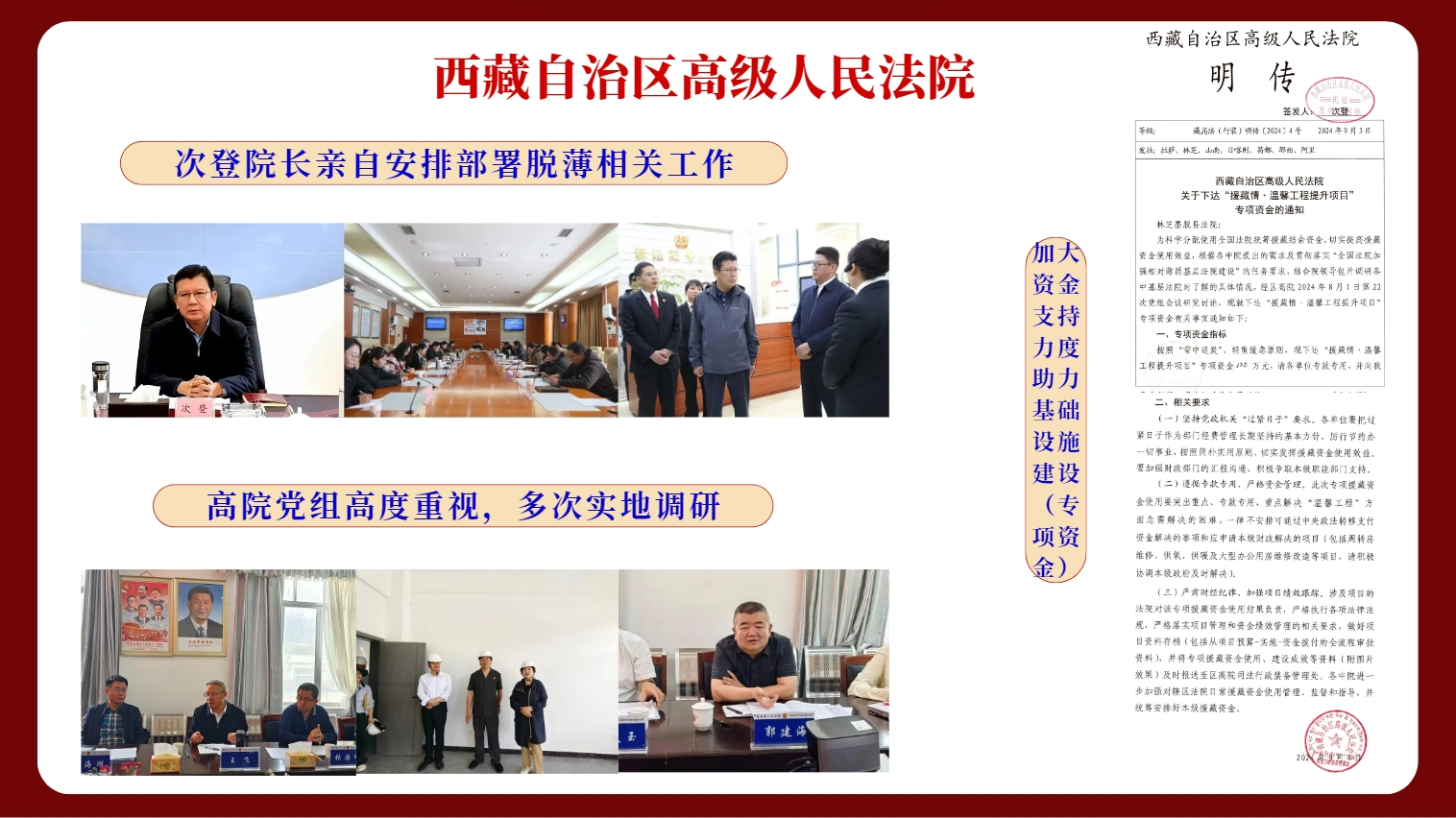 區高院次登院長高度重視、親自過問,國家法官學院、區高院、市中院、縣委多次實地調研督導脫薄工作,指導建立“一院一檔”。根據實際情況,墨脫縣人民法院全面梳理存在問題,制定脫薄方案,開出脫薄“良方”,多次就脫薄中存在的難點堵點問題,與上級法院、縣委政府溝通協調,并與佛山市中級人民法院建立對口支援聯系,凝聚脫薄攻堅合力。全院干警以等不起、坐不住的工作緊迫感,心往一處想、勁往一處使、擰成一股繩,堅定脫薄攻堅信心決心。2024年9月,張軍院長、王君正書記通過視頻連線聽取脫薄工作匯報,并對我院脫薄成果及干警精神面貌予以肯定。2025年1月,我院被西藏自治區高級人民法院評為“全區優秀法院”。