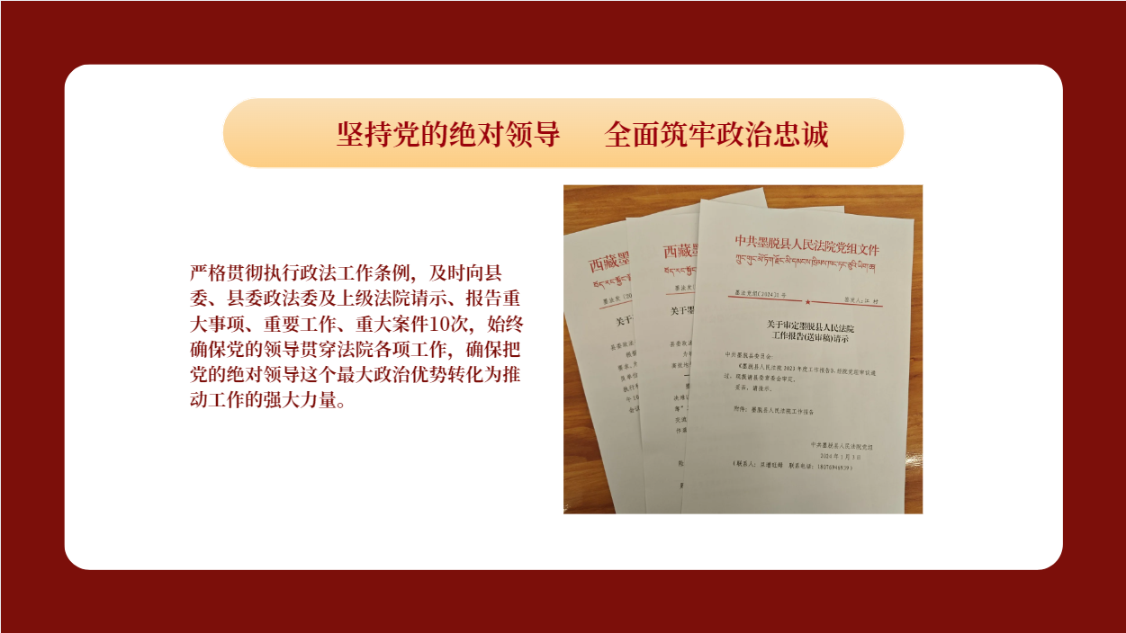 堅持把黨的政治建設置于首位,持續深入學習習近平新時代中國特色社會主義思想,貫徹落實習近平法治思想,依托黨組理論學習中心組、“三會一課”等學習形式將政治學習與推進“脫薄”工作緊密結合,做實“從政治上看、從法治上辦”。及時向縣委、縣委政法委及上級法院請示、報告重大事項、重要工作、重大案件10次,開展學習研討96次,黨組班子成員帶頭講黨課6次。深耕“紅色天平·法興墨脫”黨建品牌,扎實推進黨建帶隊建促業務工作,創建先鋒論壇、精英論壇和法官論壇,為各類案件辦理提供交流平臺,不斷通過黨建引領和案例研討提升黨員干部履職能力水平。2024年7月,院黨支部被墨脫縣委評為“先進基層黨組織”。