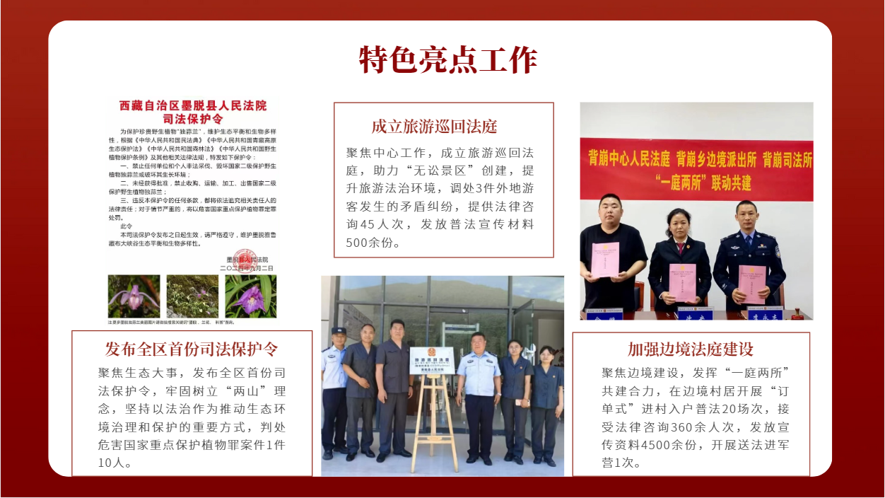 組建審判管理小組,每季度召開例會分析研判審判質量管理指標數據每月召開司法審判數據分析研判會,多維度研判審判質效問題,針對性改進加強。與文旅局、司法局聯合出臺《墨脫縣旅游糾紛“一站式”聯動解決機制》,制定《墨脫縣人民法院旅游巡回法庭方案》。與邊境管理大隊聯合簽訂《庭所共建協議》,將背崩中心人民法庭轉型升級為固邊法庭,與背崩邊境派出所和背崩司法所簽訂“一庭兩所”協議,形成“調解優先、訴訟斷后”模式。主動延伸司法職能,把執法辦案與環境保護相結合,發布全區首份《野生獨蒜蘭司法保護令》,并聯合縣林草局、達木邊境檢查站在進墨第一村貢日村豎牌,為守護好雅魯藏布大峽谷國家級自然保護區生物多樣性提供有力的司法保障。
