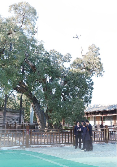2026年1月4日,清晨的渭北高原,寒意浸透了土層?!拔宋恕标兾魇“姿h史官鎮的古柏群還籠罩在薄霧中,一陣嗡鳴刺破了山林的靜謐。一架六旋翼無人機從千年古柏旁緩緩升空,螺旋槳攪動著清冽的空氣,將樹身的滄桑紋路、根部的土壤裂隙清晰地投射在地面的操作屏上。