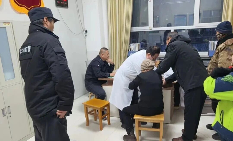 特警隊員看到后,立即停車上前,發現其中一名女子面色蒼白,正用紙巾捂住口鼻,鮮血已滲透紙巾,并不斷滴落。她聲音微弱,表示自己鼻腔出血難以止住,且頭部劇痛、渾身顫抖。她的丈夫在一旁手足無措,焦急萬分。雪越下越大,氣溫極低,等待普通車輛救援可能延誤時機。