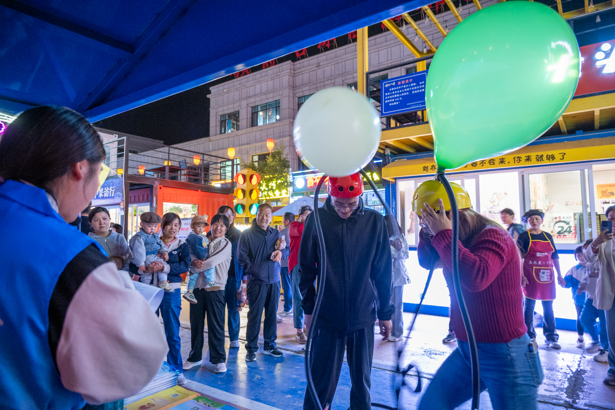 “套中了!”法治文化集市中歡呼聲不斷。彭陽縣司法局、公安局、法院、檢察院等化身“法治攤主”,在夜市中支起普法攤位,向采訪團及過往群眾普及憲法、民法典、未成年人保護法等與民生息息相關的法律法規。