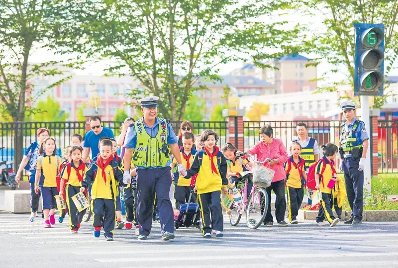 博樂市公安局交警大隊民警護送小學生過馬路(2019年8月27日攝)。馬玲香攝