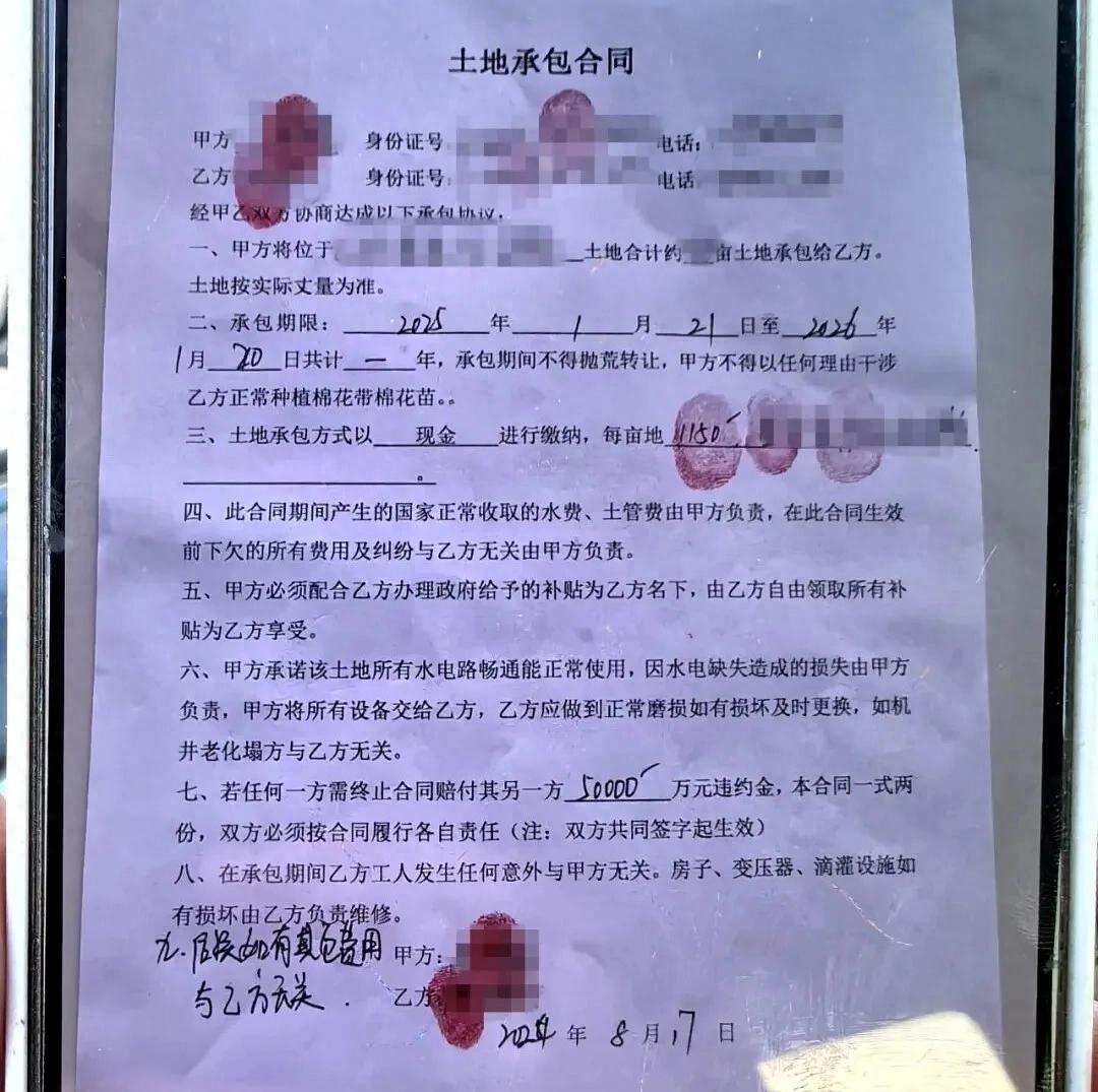 2024年8月,承包戶陳先生與31團土地出租人王先生簽定了一筆關于318畝棉花地的土地承包合同,地塊位于轄區G218國道871公里處。雙方簽定的合同中明確約定,承包費用中包含土地使用費、水費、電費等相關費用共計每畝1150元,期限為1年,自2025年1月21日生效,至2026年1月20日承包期結束,雙方當時在簽定合同時,均表示對合同內容無異議,并順利完成簽定。