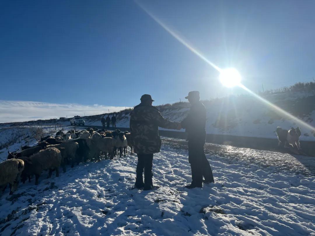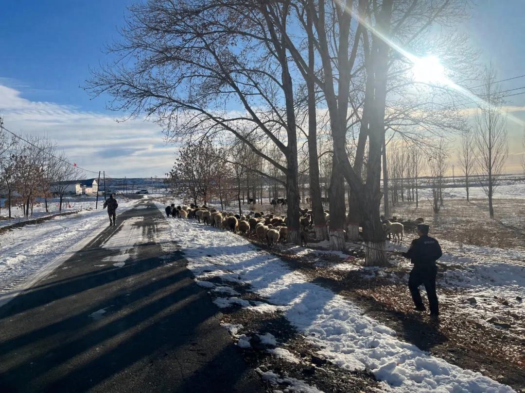 冬日的陽光恰好穿透云層,溫柔地灑在這群最可愛的人身上,為他們的身影鍍上了一層暖金色。原本慌亂的羊群,在大家的默契配合下,漸漸安靜下來,乖乖朝著回家的方向移動。