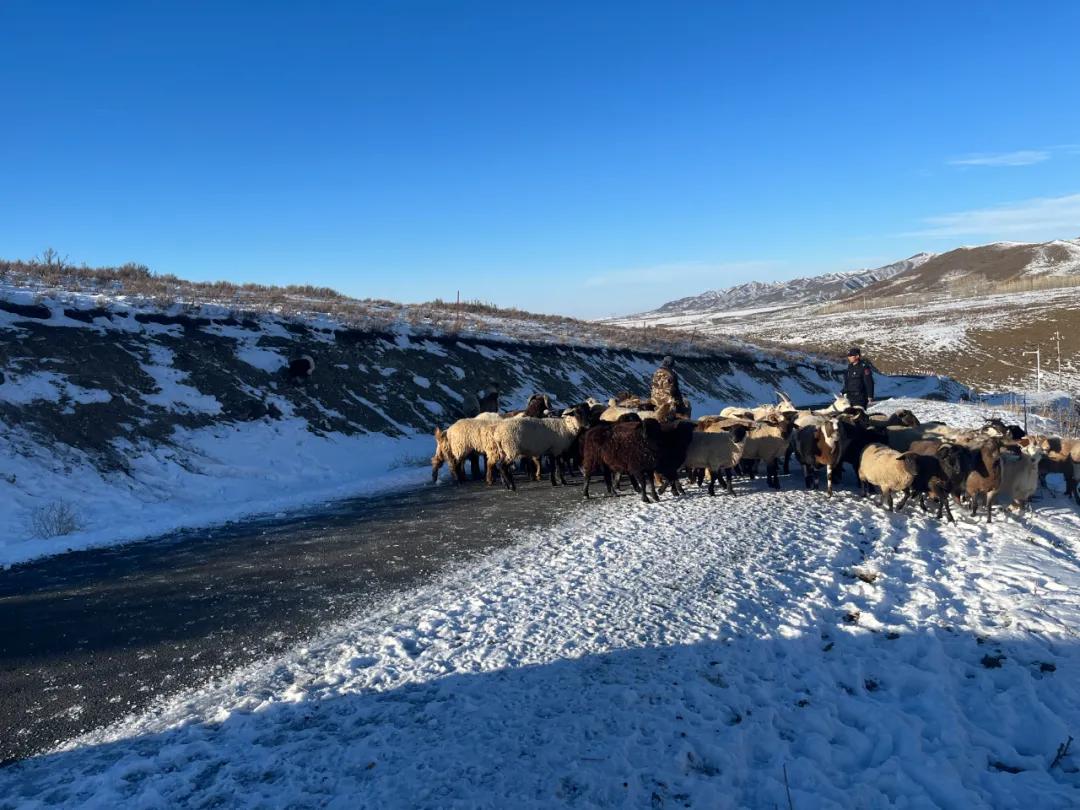 經驗豐富的護邊員繞到羊群另一邊,張開雙臂構筑起一道“移動屏障”,防止羊群繼續向外擴散。民警迎著刺骨寒風,不斷揮舞手臂,大聲呼喝著引導羊群轉向。另一名護邊員專門負責收攏那些掉隊的小羊羔,輕輕將它們趕回群體。他們的臉頰凍得通紅,褲腳沾滿雪沫,每一步都走得艱難,卻沒有一個人停下。