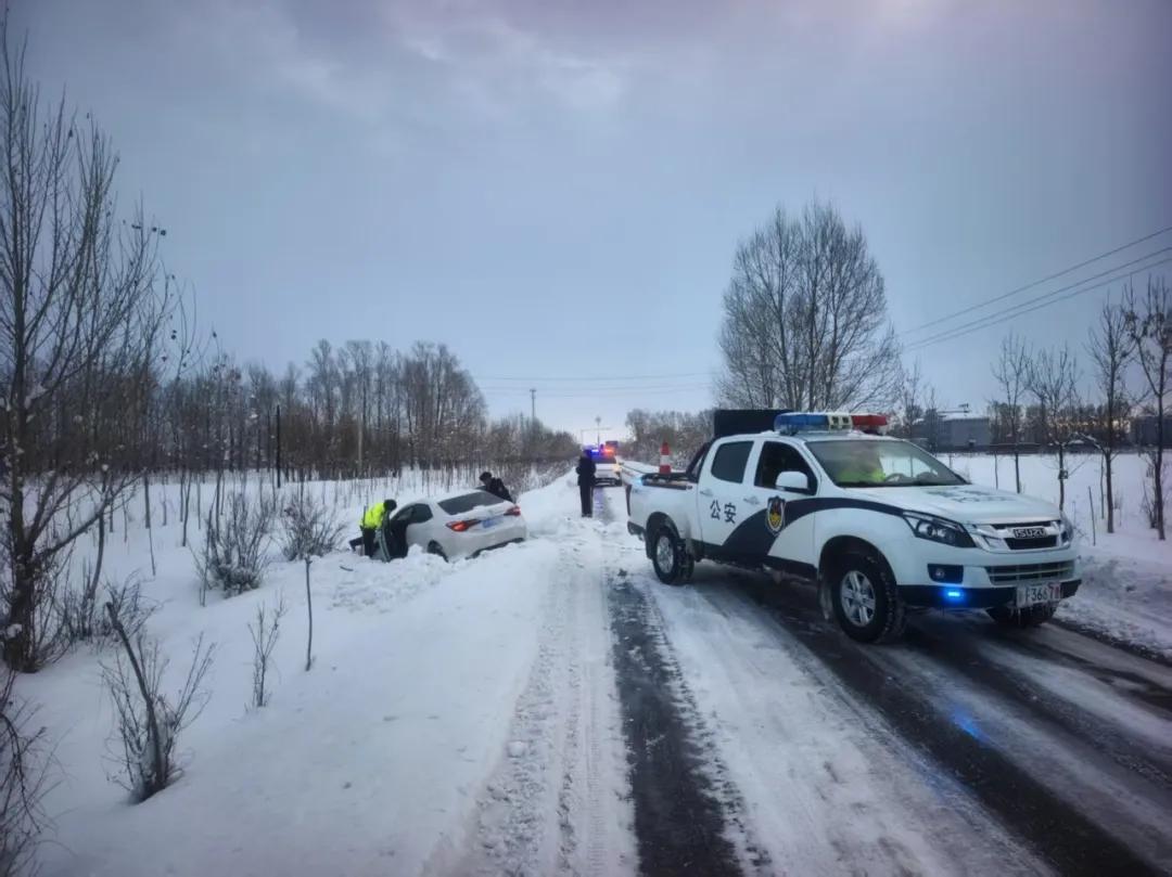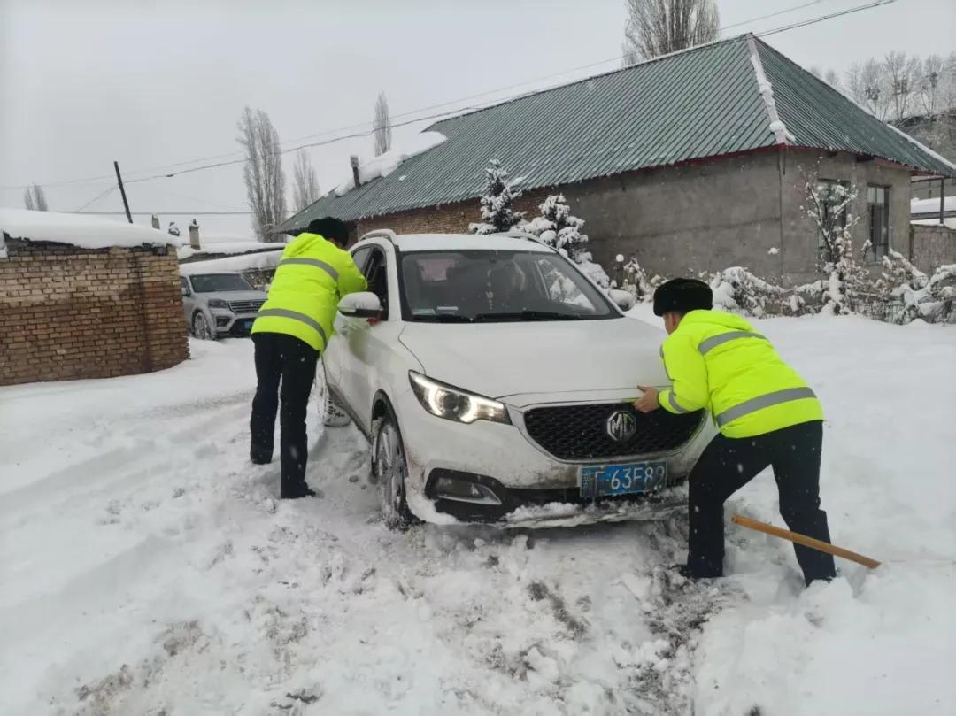 隨后,在七十六團(tuán)惠民路及周邊居民小區(qū)內(nèi),民輔警接連接到群眾求助電話,同時在巡邏中又發(fā)現(xiàn)多起車輛被困警情。他們馬不停蹄趕赴每一處現(xiàn)場,頂風(fēng)雪、戰(zhàn)嚴(yán)寒,用專業(yè)與高效化解一起起出行難題。